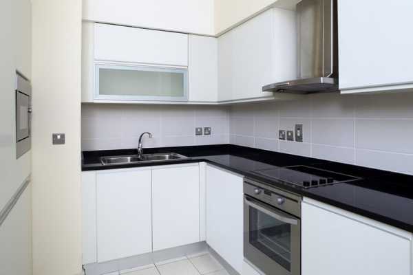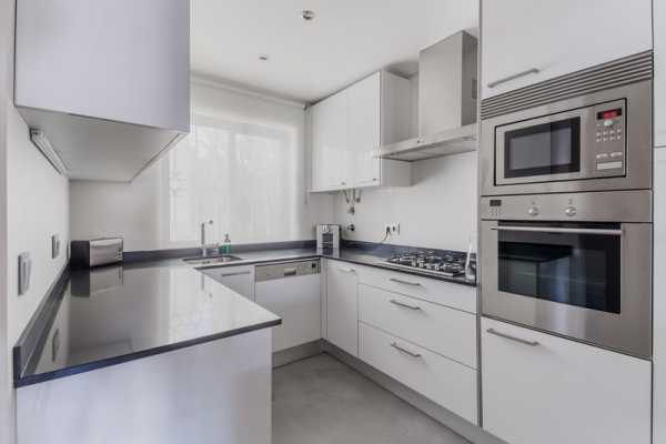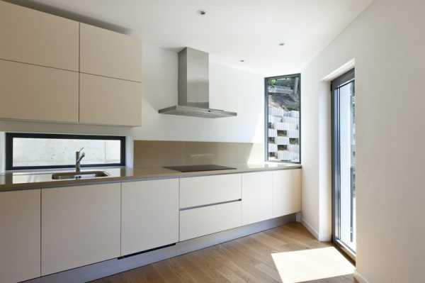 Бытовая техника встроена в гарнитур и спрятана за фасадами.Поверхности могут быть матовыми или глянцевыми. Дверцы со скрытыми ручками, либо открывающиеся при нажатии. Иногда ручки все же присутствуют, они прямолинейные, без резьбы и украшений. Никаких стеклянных дверок на шкафчиках для посуды. Отлично смотрятся кухни без верхних шкафов.