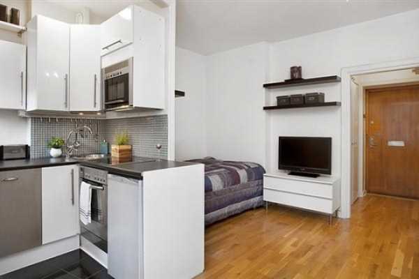 Совет: если отделить само место приготовления пищи аркой, то в небольшом помещении у Вас получится неплохая столовая.