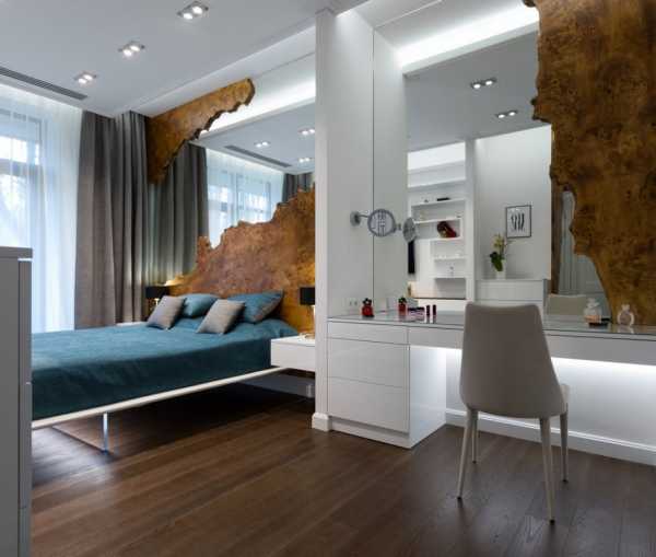 Если устанавливается гардеробный шкаф, то лучше, чтобы он занимал либо глухую стену сбоку от кровати, либо окружал по всему периметру дверной проем. Фасады предпочтительно выбирать белые и однотонные – так помещение будет казаться просторным. Для большой комнаты подойдут и деревянные, комбинированные поверхности, темные и даже яркие тона.