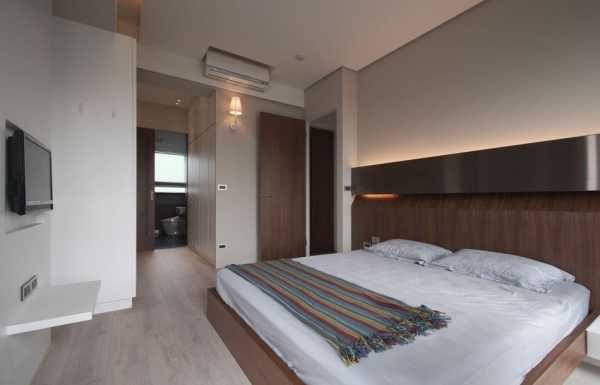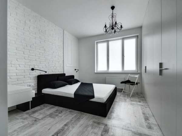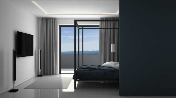 При оформлении помещения используют от двух до трех цветов. В центре комнаты – кровать. Стоит отметить, что шкафы лучше убрать, главная изюминка помещения – это большая кровать и ничего лишнего. Зачастую квартиры в стиле минимализм большие, поэтому шкафы либо встроены в стену, либо размещены в гардеробной.