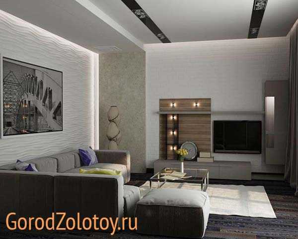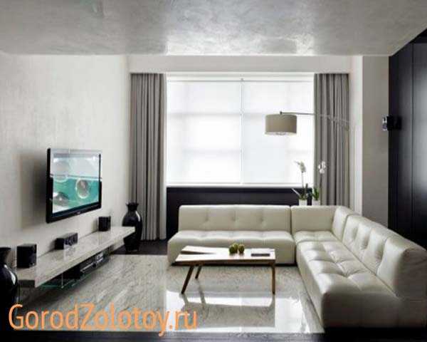 Для этой комнаты в стиле минимализм будет характерно наличие строгих очертаний. Телевизор можно повесить на стену или поставить на журнальный стеклянный стол.