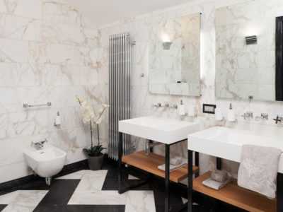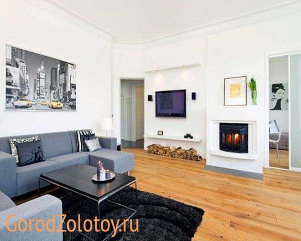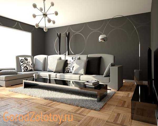 В каждом отдельном помещении можно создать оригинальный свой стиль для подчеркивания функциональности помещения. Так, в ванне и на кухне установите плитку и используйте глянцевые поверхности, а в спальне и гостиной хорошим решением станет наличие однотонного ковра с длинным ворсом и материалов из натурального дерева. Пол может быть в виде черного или белого паркета без рельефа. Рассмотрим каждое помещение подробнее.