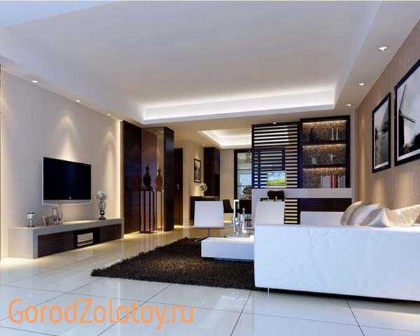 - Потолок. На верху помещения в первую очередь не должно быть никаких громоздких конструкций, больших люстр, барельефов или узоров в виде лепнины. Минимальное количество деталей и белый цвет как нельзя лучше подойдут к вашему интерьеру. Идеальным решением при этом будет навесной потолок, который не только позволит установить множество светильников, не загромождая пространство, но и выгодно расширит пространство за счет глянцевой поверхности.