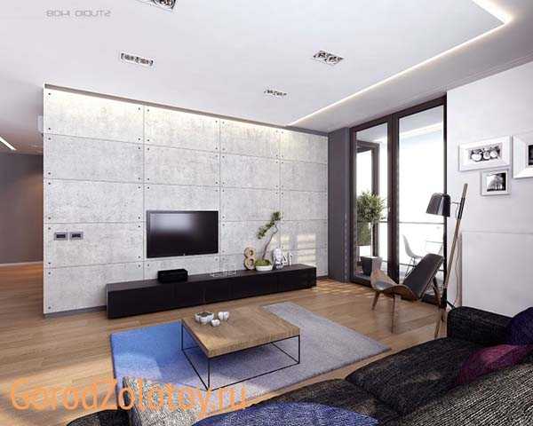 А вот от привычной стенки с множеством открытых полочек придется отказаться. Не используйте настенные украшения или картины, стены должны оставаться чистыми. А вот квадратный однотонный ковер в центре комнаты подчеркнёт ее правильность. Для отделки можно использовать деревянные панели или же выбрать стальной цвет под технику.