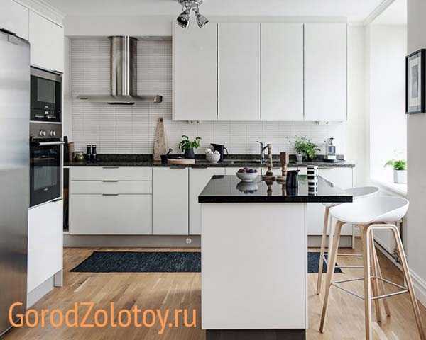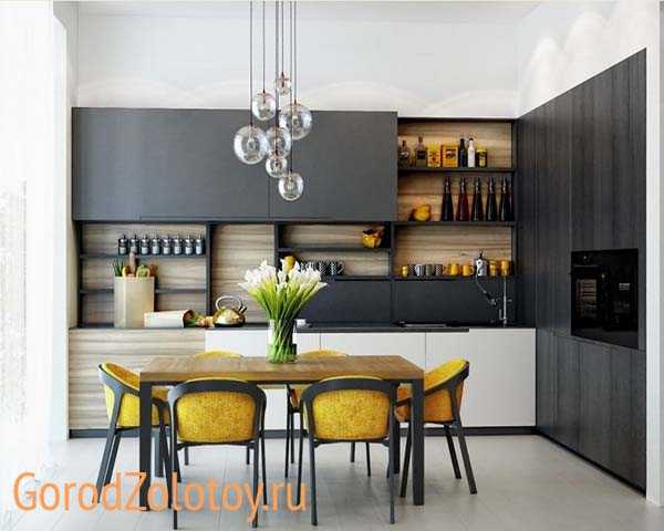 Отдельно стоит упомянуть качество отделки и материалов: все они должны быть прочными, устойчивыми к влажности и загрязнениям, при этом сохранять эстетичность в течение многих лет. Указанным требованиям в наибольшей степени отвечает керамогранит, натуральный и синтетический камень (мрамор, гранит), закаленное тонированное стекло, сталь, обработанная восковой пропиткой древесина. За такими поверхностями легко ухаживать, а интерьер кухни смотрится по-настоящему изысканно и элегантно.