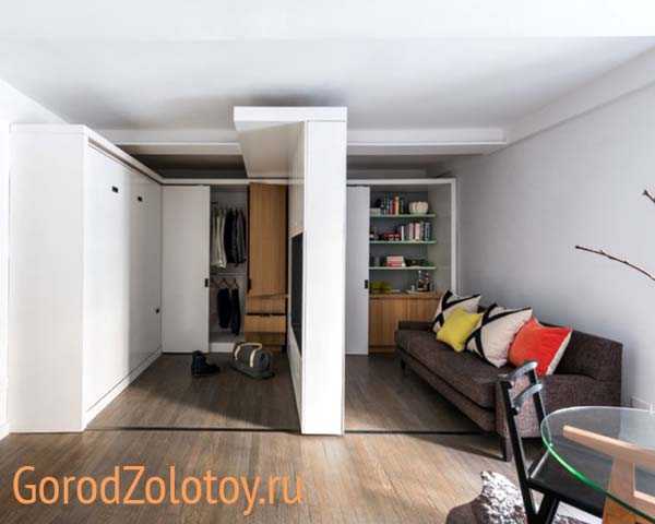 Скройте все, что можно скрыть: встроенные шкафы-купе, большие полки на стене, но без эффекта создания дополнительного объема в помещении. Для этого совсем не обязательно сооружать громоздкие перегородки из гипсокартонаИдеальный вариант — раздвижные перегородки для зонирования комнаты, которые помогут минимизировать потери полезной площади.