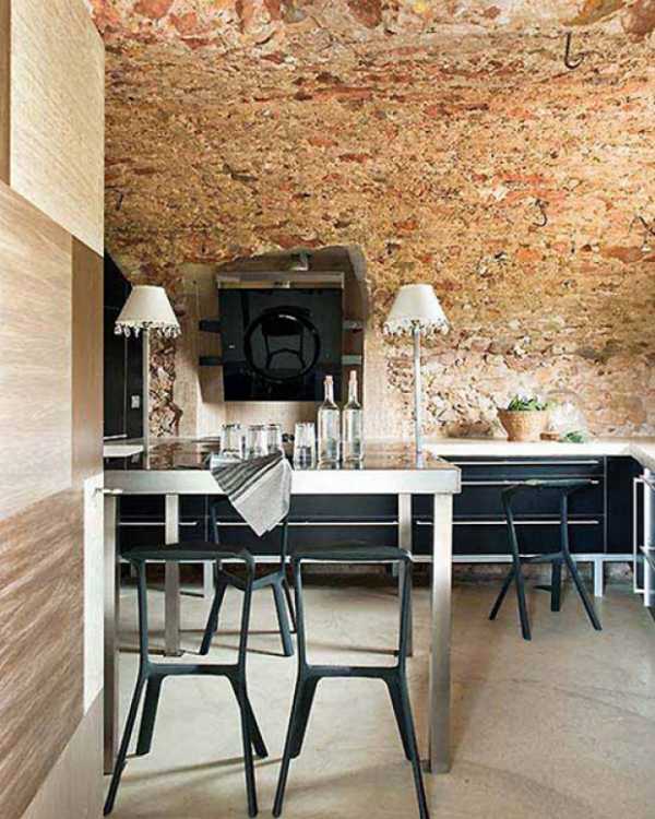 - Для фартука над столами и мойкой можно использовать панель, имитирующую каменную кладку.