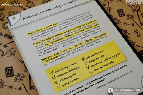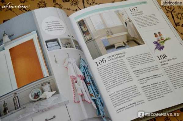 Многие советы универсальны и подойдут как для владельцев больших частных домов, так и для хозяев маленьких квартир. Некоторые идеи, конечно, не новы, но, тем не менее, книга достаточно любопытна и легко читается. Вообще написано просто, доступно и жизнерадостно. Хочу отметить также удобное оформление текста — все четко разложено по полочкам. Все руководства пошаговые, кроме того, даны задания на неделю.