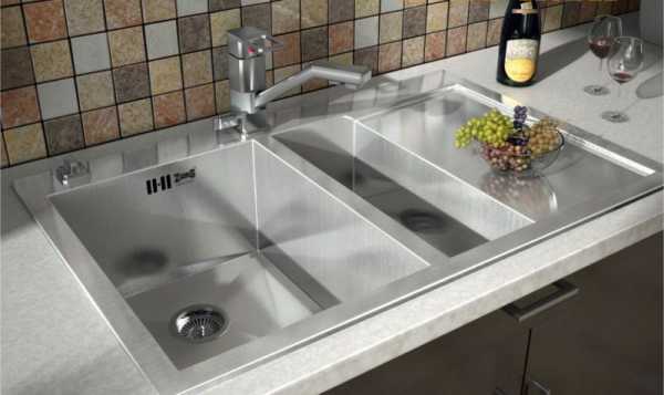 Мойка из нержавейки с двумя чашами — модели данной конструкции чаще всего устанавливаются в одну линию. Возможна также установка изделия под углом к крану. Такая раковина очень удобна и функциональна, однако используется она, преимущественно, на достаточно просторных кухнях.