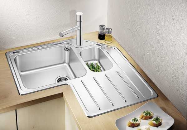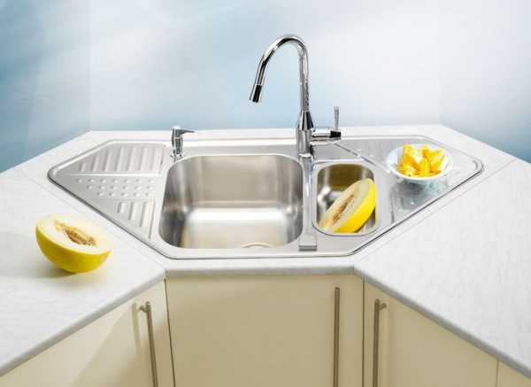 Лучшим решением для малогабаритной квартиры может стать компактная угловая мойка на кухню из нержавейки. Зачастую она состоит из двух одинаковых прямоугольных чаш, которые располагаются под углом друг к другу, а пространство между ними является рабочей зоной. Встречаются угловые модели и с одной чашей, дополненные маленьким отделением для мойки овощей с колландером, который напоминает дуршлаг, и поверхностью для сушки посуды. Иногда рабочие поверхности в угловой мойке располагаются с двух сторон от одиночной чаши.