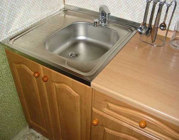 Врезную мойку из нержавейки можно расположить в одной плоскости с другими тумбами. Наиболее востребованным является первый вариант, но при условии, что столешница изготовлена из ДСП.