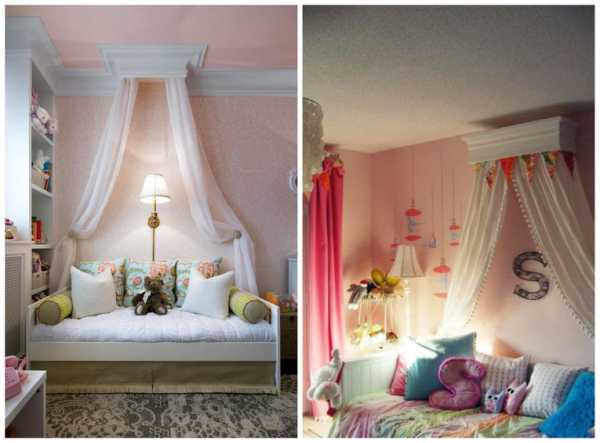 Если ваш ребенок подрос и спит на диване, это не повод отказываться от балдахина, поскольку в детской комнате он уместен не только над кроватью. Главное ― правильно выбрать расцветку, фасон и аксессуары.