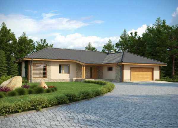 Коттеджи с пристройками для автомобилей бывают одноэтажными, двухэтажными и с гаражом в цоколе.