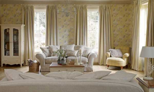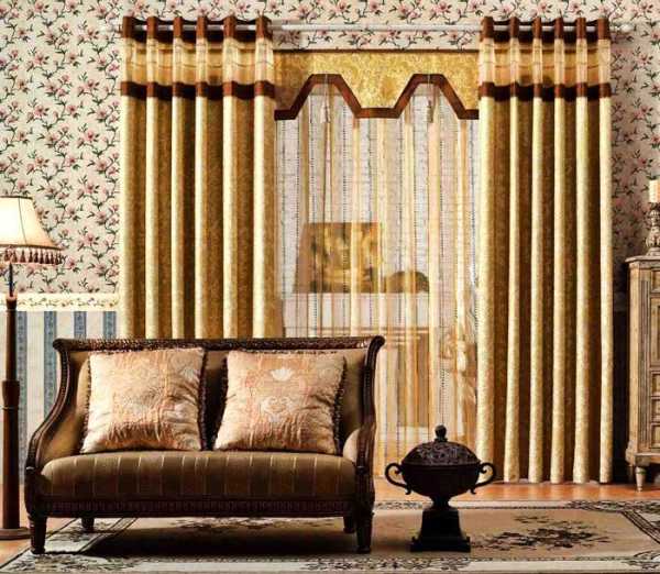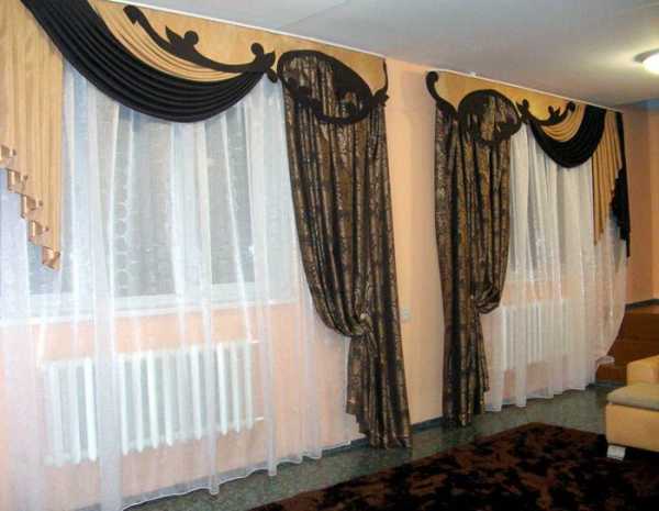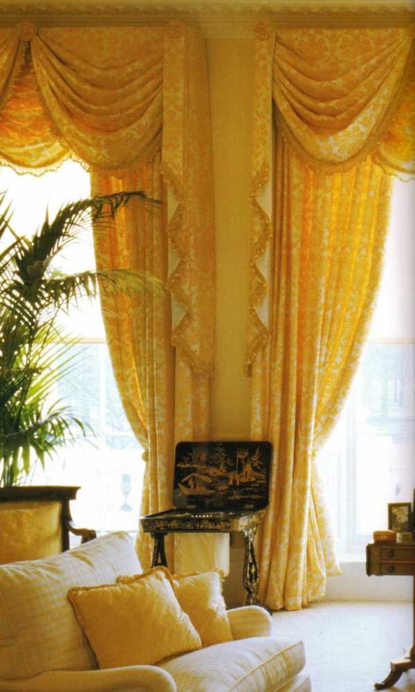 Например, в большой гостиной можно повесить полотна из дорогой, плотной ткани, красивые, красиво при этом украсить их ламбрекеном, декоративными воланами и кистями.