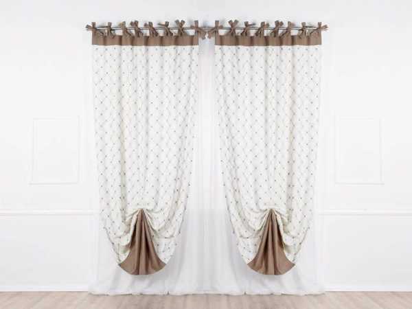 Другой вариант крепления типа петель — завязки. Они выглядят как узелки или бантики. Часто изготовлены из той же ткани, что и занавески и просто пришиты к ним. Иногда завязки подобраны отдельно и могут быть продеты в отверстия.