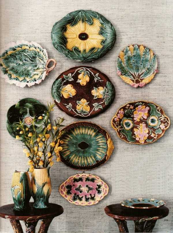 Над комодом или этажеркой, расположенной в коридоре или прихожей можно разместить композицию из тарелок разных форм, расцветок и размеров. На однотонной отделке стены такой декор будет выглядеть особенно эффектно.