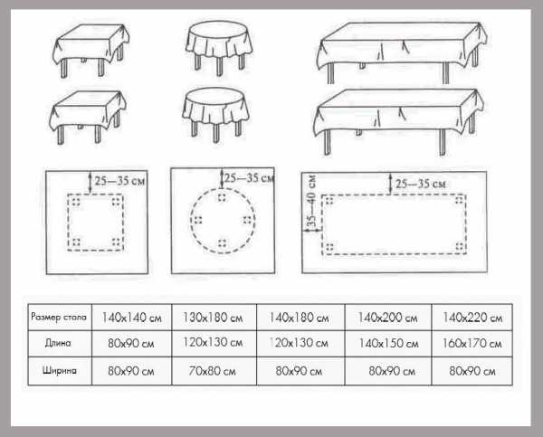 Размер скатерти подбирается индивидуально. Её края должны свисать на 20-30 сантиметров ниже кромки стола равномерно по всему периметру. Углы скатерти размещаются строго вниз параллельно ножкам.