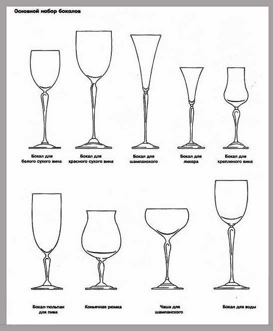 На стол нужно выставлять такое количество бокалов, сколько напитков предполагается подавать во время трапезы. В классическом варианте предусматриваются бокалы для белого и красного вина и стакан для воды.