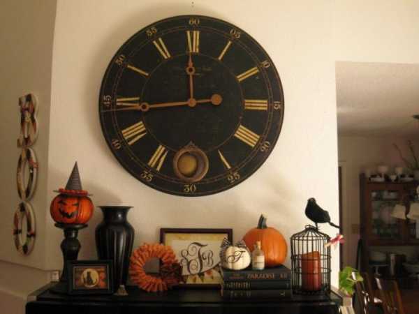 В большинстве стилей принято вешать большие часы в интерьере и ними декорировать поверхность стены. С такими часами не сложно создать роскошный интерьер. Гостиная становится более таинственной с таким «декором».