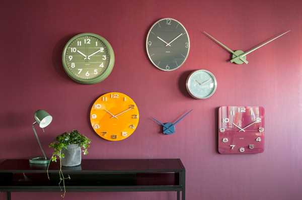 Интересный вариант – использование нескольких разных видов, чтобы сделать нужный акцент в оформлении. Часы лучше выбирать те, что смогут подойти под тот или же иной стиль интерьера – стеклянные, пластиковые, деревянные, картонные.