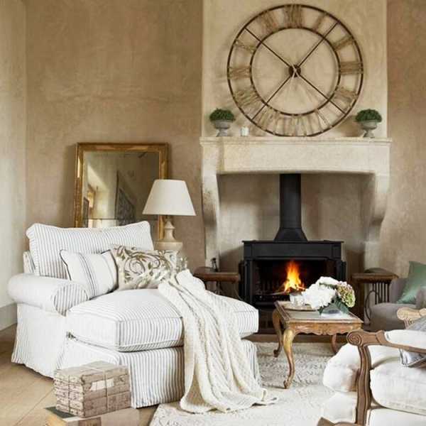 Лучше всего применять большие часы в интерьере гостиной просторного особняка. В домах с настоящим камином часы располагаются именно над ним, чтобы придать комнате особого уюта.