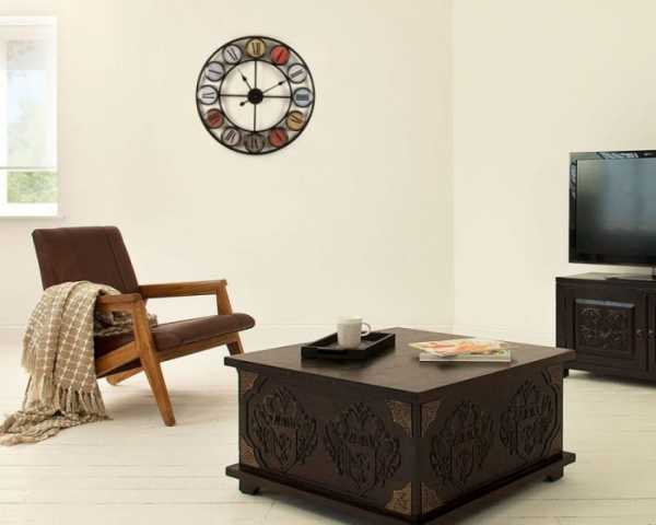 Оригинальный дизайн настенных часов можно оформить под мебель в гостиной