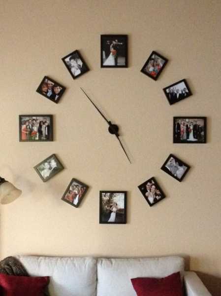 Интересно смотрятся оригинальные большие часы в гостиной с картинами вместо цифр