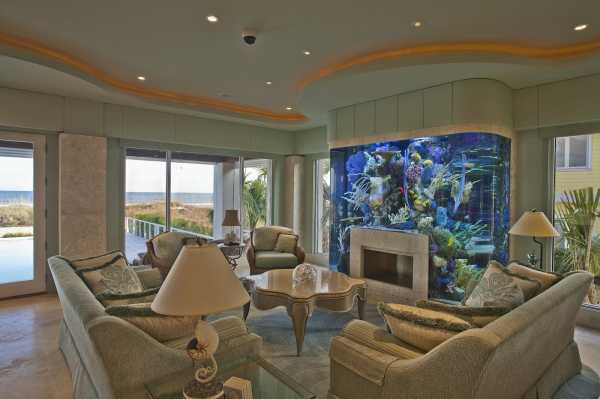 Аквариумы чаще всего бывают прямоугольными, но изготовленные на заказ конструкции могут быть более гибкими с точки зрения формы. Например, этот аквариум от Aquarium Architecture имеет закругленные углы и выглядит немного иначе, чем обычные аквариумы. Помимо подобных «овальных» часто встречаются еще и шестиугольные аквариумы, но обычно они бывают в виде отдельных объектов, а не встроенных.