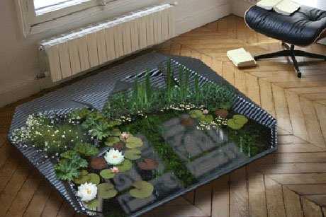 Французский дизайнер Бенджамин Грейндордж в своей работе всегда руководствовался единым правилом: «Быть ближе к природе». Одно из его творений называется «домашний пейзаж»: в емкости из плотного пластика (1 м на 1,5 м) дизайнер предлагает нам устроить у себя в комнате настоящий «домашний пруд» с рыбками, растениями и кувшинками.