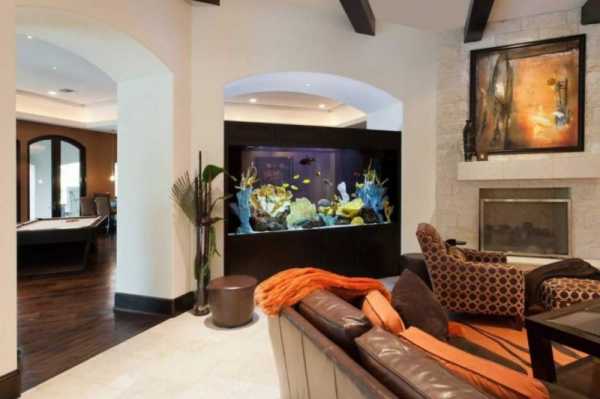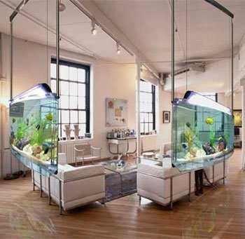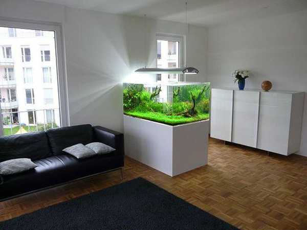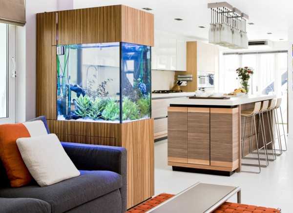 Аквариумы, разделяющие комнату – это не новая концепция, но она великолепна во многих отношениях. Благодаря своей прозрачности, аквариум как перегородка в интерьере дома с открытой планировкой просто идеален, ведь он добавляет ощущение уединенности, сохраняя при этом пространство светлым и просторным.