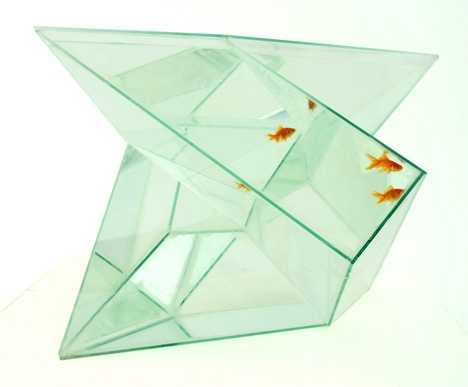 Француз Амари Пудро (Amaury Poudray) родом из городка Сент — Этьена выучился в колледже Ecole Supérieure Art & Design и решил, что должен в этой жизни создать что-нибудь особенное.В итоге он взял и выдул из стекла замысловатый аквариум продолговатой формы, который держится на тончайших ножках.С виду конструкция кажется удивительно хрупкой, но Амари Пудро рассчитал все до мелочей так, чтобы конструкция из стекла держала равновесие на тоненьких стальных прутах. Кажется, будто у аквариума вовсе нет отверстий, но они имеются, просто на первый взгляд их не видно. А вот рыбки, благодаря продолговатой форме жилища, кажутся то удлиненными, то утолщенными.