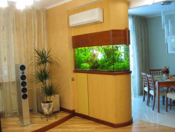 Хочется поговорить о роли аквариумов в современном интерьере квартиры, дома и даже офиса. В наше время, когда жизнь за окном стремительно несется куда-то, все чаще и чаще хочется создать у себя дома уютный уголок спокойствия и умиротворения. И таким уголком, в полной мере, может стать аквариум. Ведь не даром считается, что наличие аквариума в доме – это один из эффективнейших метод избавится от ежедневных стрессов, снять усталость и напряжение. А сколько интересных идей вы можете воплотить при создании водного мира! Тем более в наше время ограничений в их размерах и формах нет. Красивый аквариум в интерьере квартиры фото: