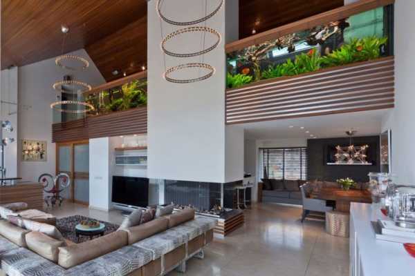 Удачно названная «Вилла с аквариумом» создана Centric Design Group и находится в Нидерландах. Аквариумы, выполняющие роль ограждения мезонинного этажа, делают интерьер дома совершенно уникальным. Каждый из находящихся на нижнем этаже может просто поднять голову, чтобы посмотреть на рыбок, плавающих над головой. Какая отличная альтернатива обычным перилам! Стеклянный камин на первом этаже перекликается с аквариумом и делает пространство светлым и воздушным.