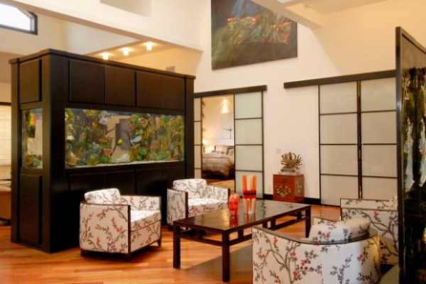 Встроенный в шкаф аквариум, зонирующий помещение.