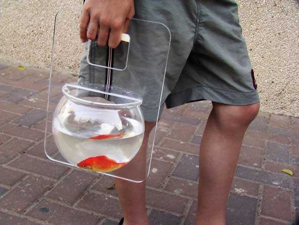 Идея совместить в переноске для рыб круглый аквариум с плоской удобной ручкой пришла в голову студенту дизайнеру Мичалу Шабтиали (Michal Shabtiali).Такая переноска предлагается как альтернатива целлофановым пакетам, в которых обычно продают рыбок на зоорынках. Удобная ручка позволяет прочно удерживать аквариум в руках, не боясь уронить.