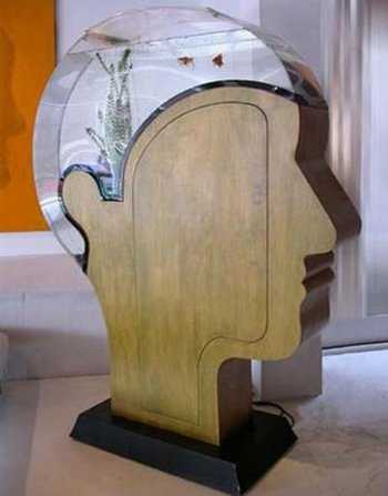 Дизайнер под псевдонимом Николя Л. спроектировал и воплотил в жизнь 2 варианта аквариума необычной формы, а точнее в форме человеческой головы.Первый вариант полностью сделан из плотного пластика, открывается сверху и не подразумевает грунта, растений и другого декора. На фотографии в аквариуме и вовсе виден одиноко плавающий петушок, которому явно не хватает общения и укрытий. Смотрится произведение Николя Л. очень стильно, хотя рыбок туда можно и вовсе не запускать.Вторая «голова» в 2 раза больше первой по размеру, ставится она на пол, а не на стол, и состоит на 70% из дерева.
