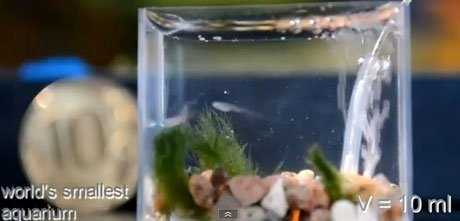 Самый маленький в мире аквариум изготовил известный омский микроминиатюрист Анатолий Коненко. Объем аквариума составляет всего 10 миллилитров (около 2 чайных ложек), однако, там разместились 5 рыбок данио рерио.На изготовление аквариума у мастера ушло около 3 недель. Самым сложным оказался процесс изготовления компрессора, который пришлось делать самостоятельно. «Аппарат пришлось делать самому, потому что таких маленьких рассекателей воздуха просто нет», – рассказывает Коненко. – «Оказывается, по конструкции это очень сложная вещь. Пять или шесть разных конструкций сделал и всегда воздух был – очень крупные пузырьки прилипали к стенкам аквариума и на саму трубку. Поэтому это была одна из самых сложных задач». (дада, вчера на бесполезном ><)