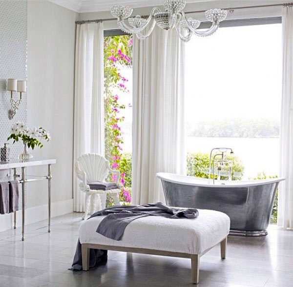 Напоследок нам хотелось бы привести еще несколько примеров, какими сегодня бывают красивые ванные комнаты. Частные дома не только позволяют сделать ванную больше, но придают ей важную особенность в виде окна. Этот элемент открывает безграничные возможности дизайна, начиная с размещения ванны у окна и заканчивая установкой пышных занавесок.