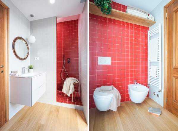 - Если отделать одну стену в ярких тонах, а другие в более теплых, то таким образом будет создан акцент в помещении, который будет отвлекать внимание от дефектов ванны, например, труб, которые не скрыты или неровных стен.