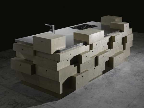 Данная кухонная столешница выглядит особенно необычно, но тем не менее следует стилю. Большое количество ящиков для хранения смотрится монолитными блоками, сделанными из массива берёзы.