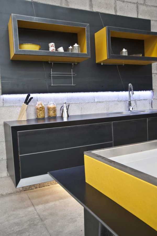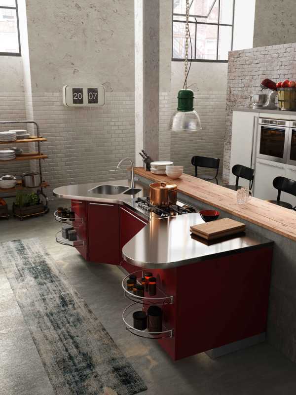 Поверх основы располагается стальная рабочая поверхность с минималистичными раковиной и плитой. Такие решения выбраны для создания как практичного, так и радующего взгляда дизайна.