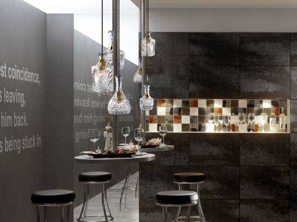 Интересной идеей станут стеклянные панели. Они зачастую имеют 3D изображение или геометрическую абстракцию. Таким образом у вас получится заменить обычную керамическую плитку.