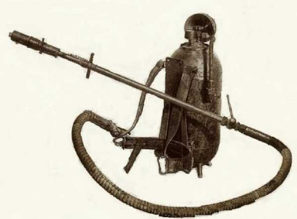 Первые ранцевые огнеметы были изобретены немцами в начале XX века и применялись в Балканской войне. На них красовалась надпись: «Против закона Божьего и человеческого».