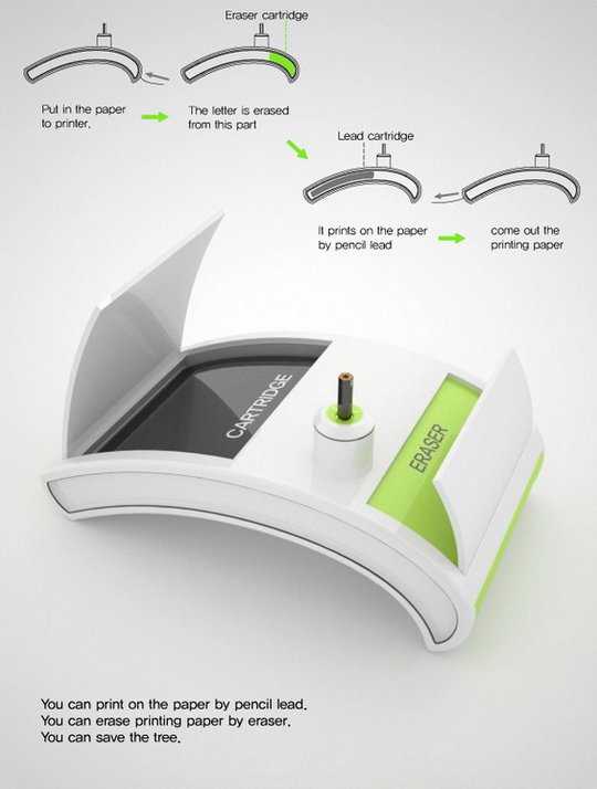 09. “Карандашный” принтер (Дизайнер – Hoyoung Lee). Вставляем стирательную резинку и простой карандаш и принтер готов к работе