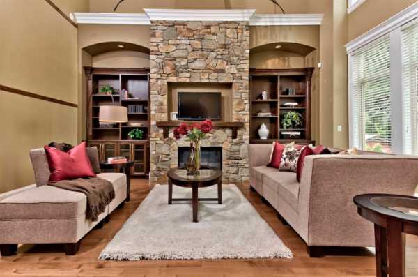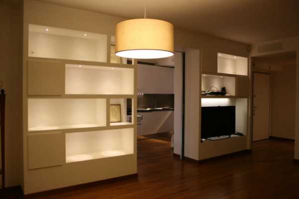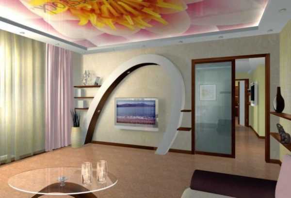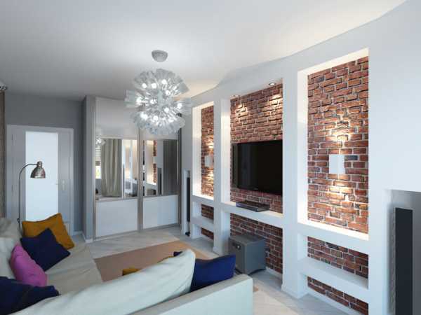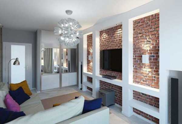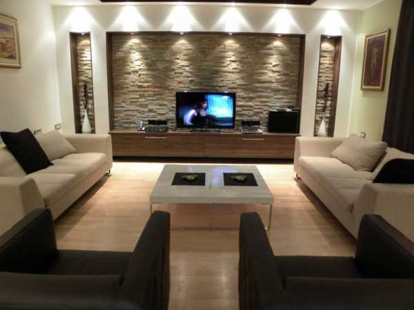 В более просторном зале будет уместно обыграть нишу разнофактурными материалами, например такими как, рельефная плитка, декоративный камень и кирпич, дерево, дсп, ламинат, зеркало, декоративная штукатурка и многое другое. Еще больше выделить и акцентировать внимание на не сквозном проеме с тв-панелью, получается за счет багетов, молдингов или оригинальной подсветки, придающей архитектурной композиции особой эксклюзивности.