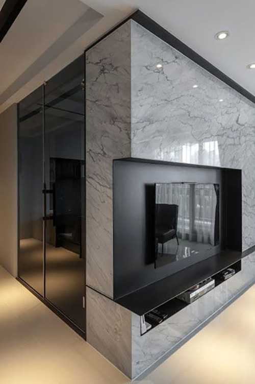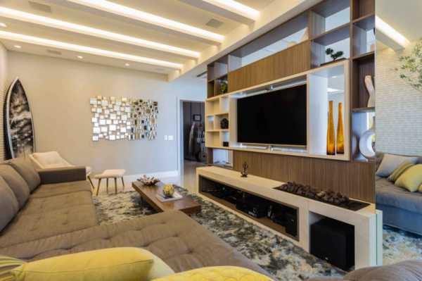 Такое углубление, не только представляет собой центр целой композиции и является полноправным дизайнерским элементом, но и предоставляет возможность спрятать провода и гармонично вписать колонки и всю нужную технику в пространство, при этом не разрушая его визуальную составляющую.