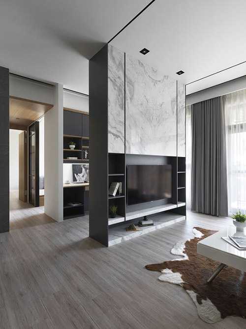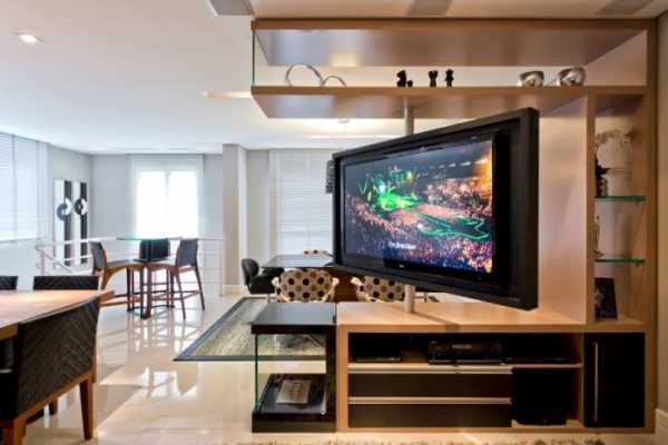 В некоторых случаях нишу используют для декоративного зонирования помещений. Тогда телевизор играет роль перегородки в помещении. В этом случае очень важно, чтобы размер ниши под телевизор походили под его пьедестал, для нормальной и безопасной установки устройства. Для такой конструкции замечательно подойдет устройство с вращающимся основанием – так можно будет по очереди смотреть телевизор в разных частях комнаты. Все элементы получившейся конструкции должны быть исполнены в светлых тонах, поскольку темный гипсокартон будет создавать впечатление дыры в помещении.