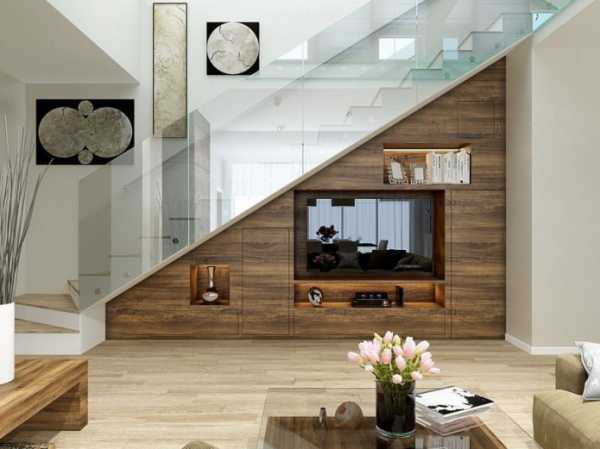- Под лестницей. Грамотно вписанная в пространство ниша, может занять центральное место в оформлении комнаты, отодвинуть лестницу на второй план и сделать конструкцию менее громоздкой.