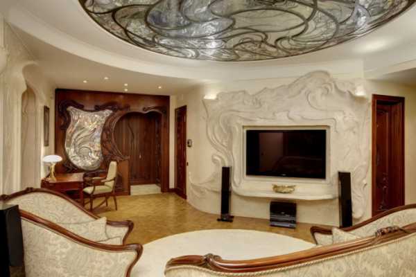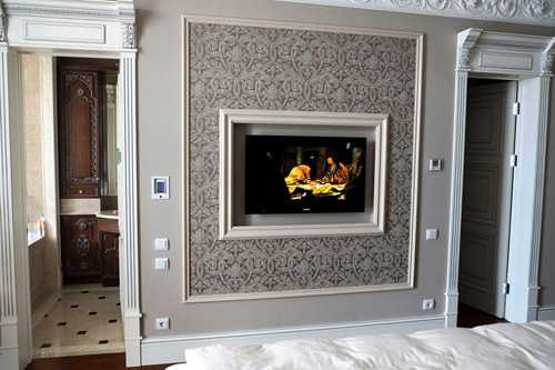 Данный декор наделяет дизайн особой респектабельностью и аристократизмом. Плазма, утопленная в лепных узорах, станет невероятно презентабельным элементом комнаты.