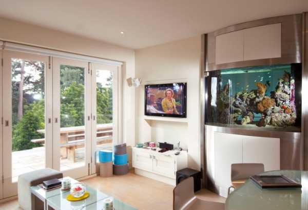 - Полки вокруг телевизора можно использовать для размещения шкатулок, статуэток, книг, некоторые даже ставят небольшой аквариум.
